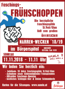 Veranstaltungen AlleAnstehend2018 So.11Nov.2018 Narren-Wecken11:11BürgerspitalKarten bei ÖTicket Sa.22Dez.2018 Namla-Singers10:00Hauptplatz St. VeitGemeinsam mit dem Roundtable Sitzungen AlleAnstehend2019 no event